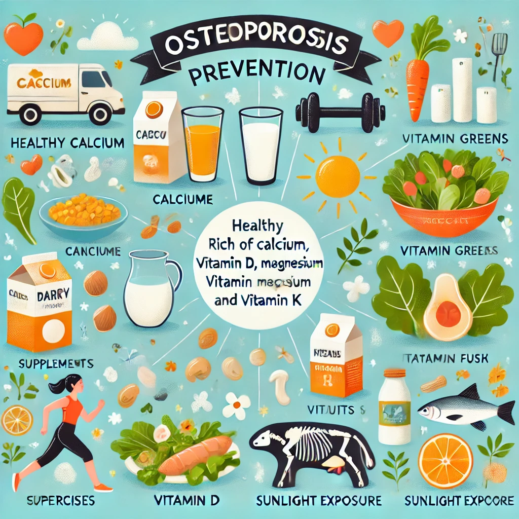 - 균형 잡힌 식단: 칼슘, 비타민D, 마그네슘, 비타민K가 풍부한 음식을 골고루 포함합니다.